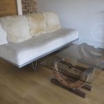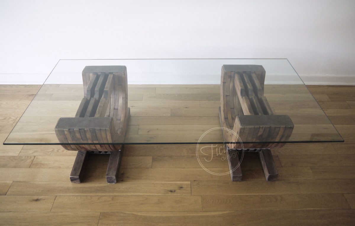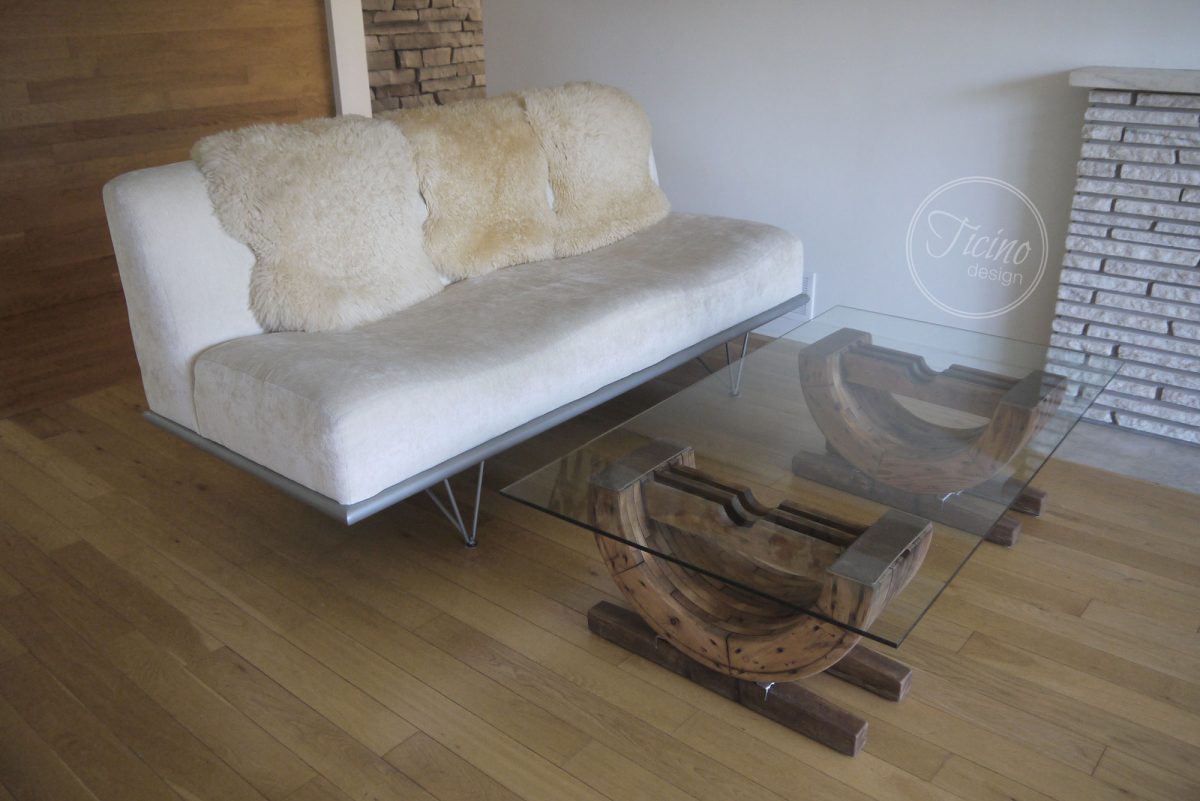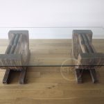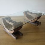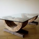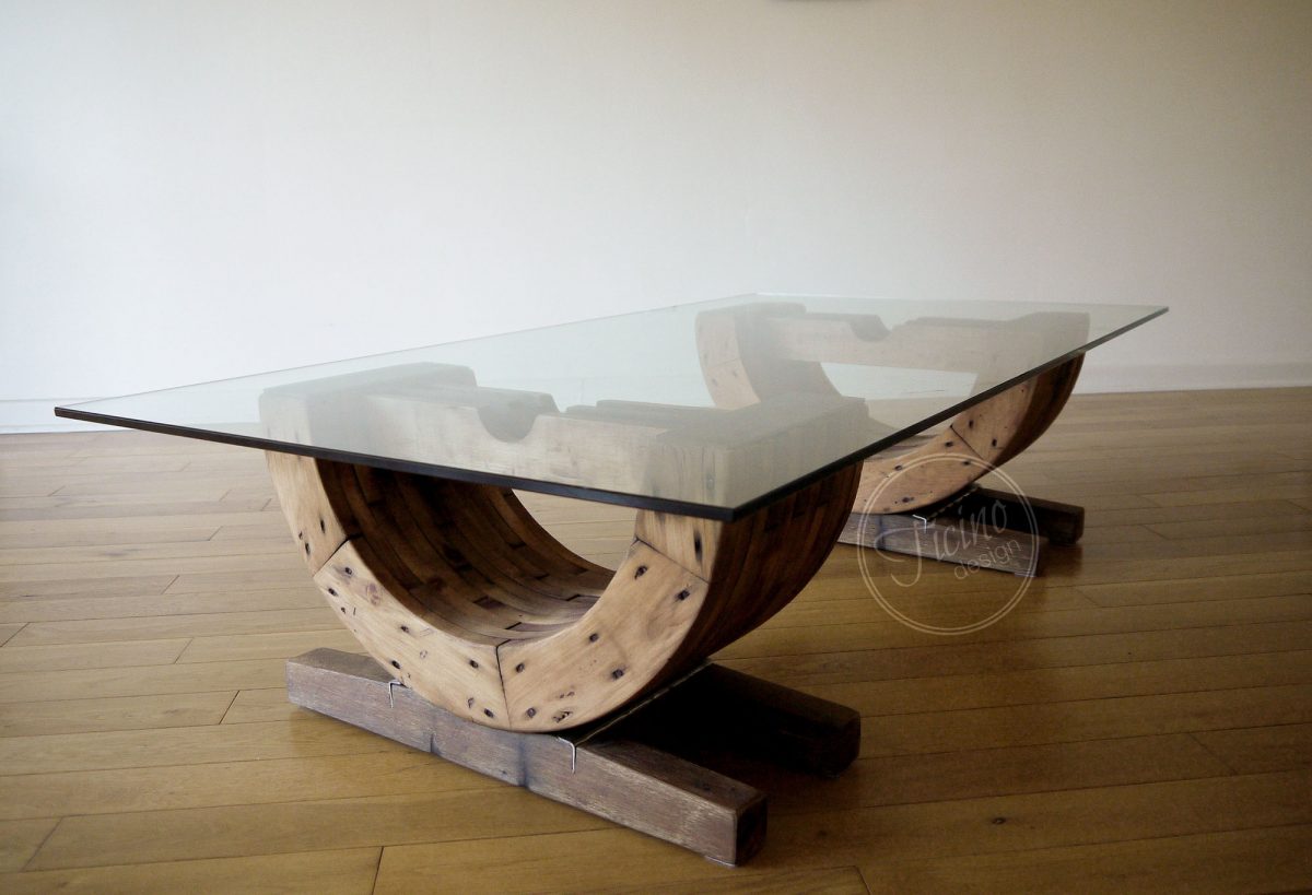 Antique wooden flywheel sliced in half and reinvented as a structural base that supports a glass tabletop.