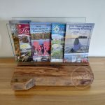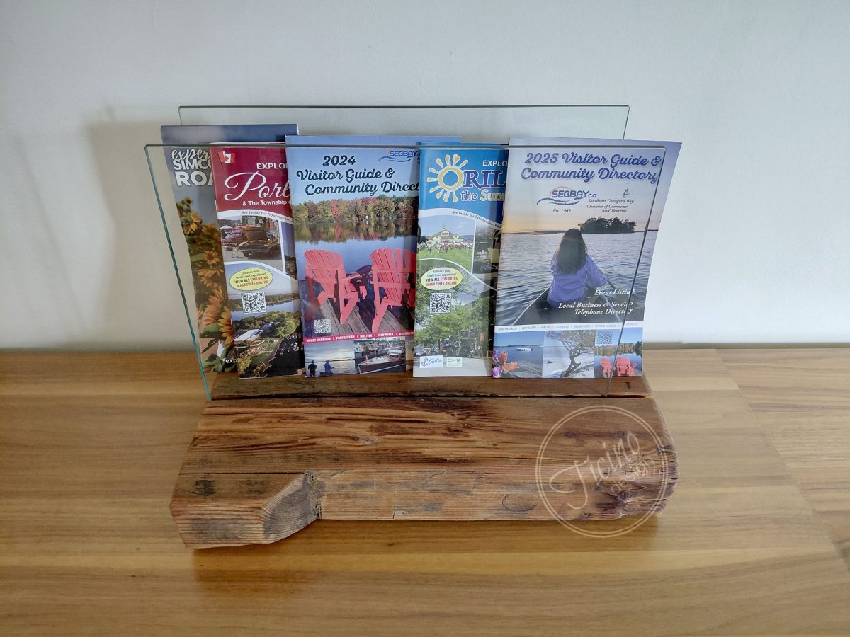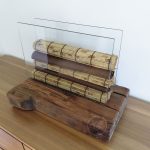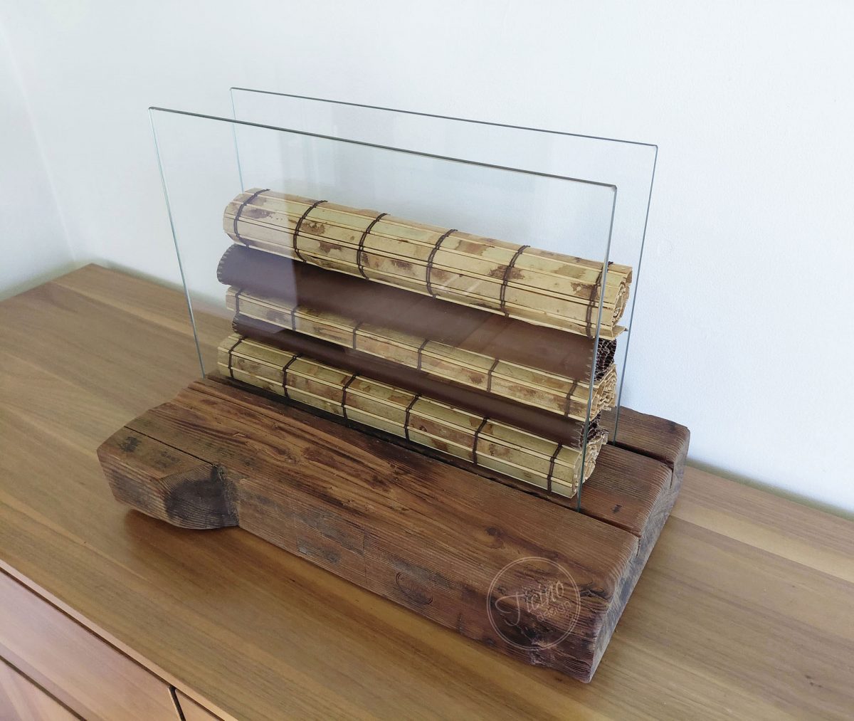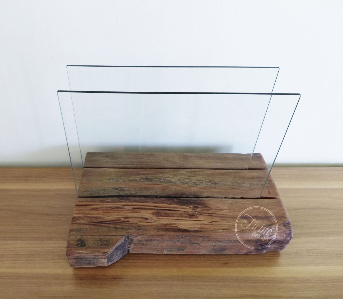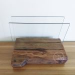 Reclaimed Wood Presentation Stand Clear glass panels slice through a piece of reclaimed wood functioning as a minimalistic magazine holder. $220 View In Store
